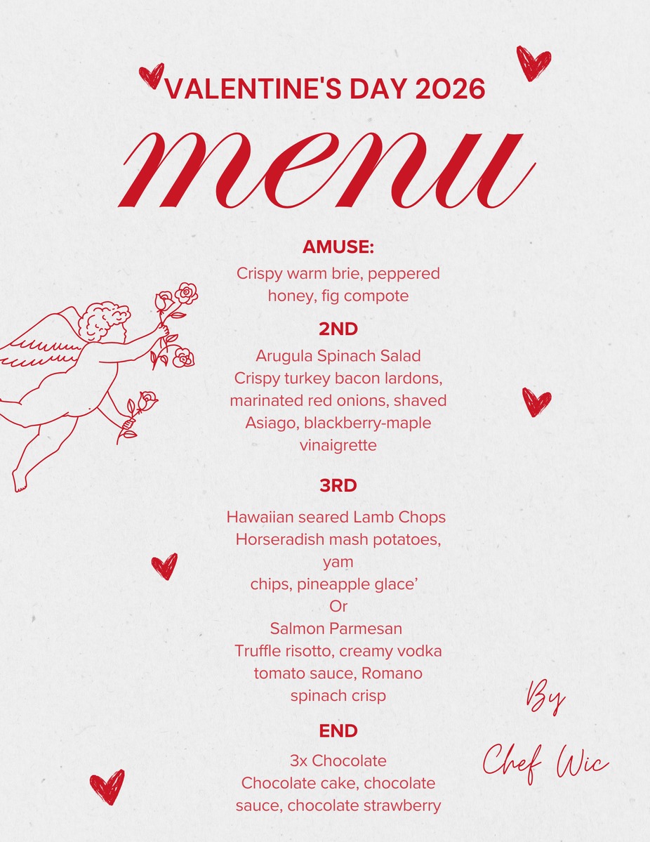 Get ready for an unforgettable Valentine Day Dinner in 2026 with Chef Wic! Join us in person for an evening filled with love, laughter, and delicious food. Whether you're celebrating with that special someone or just want to enjoy a cozy night out, this event is perfect for setting the mood. Donāt miss your chance to make lasting memories and enjoy great company. Mark your calendar and letās make this Valentineās Day one to remember! Limited tickets available ā get yours now!